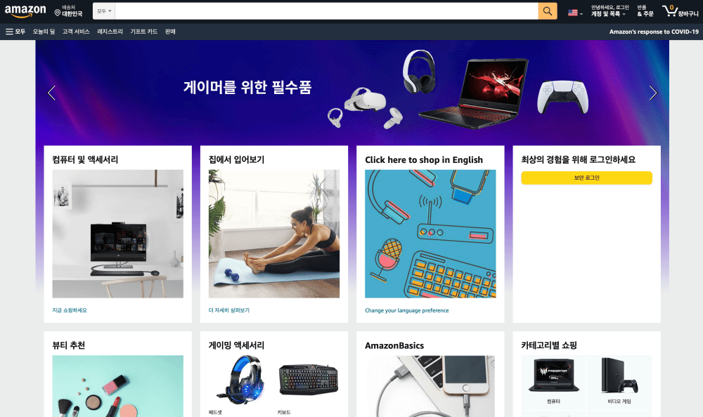 미국 아마존 웹사이트에 접속하면 메뉴가 전부 한국어로 되어있는 것을 볼 수 있을 거예요. 이전보다 훨씬 접근하기 쉬워졌죠!