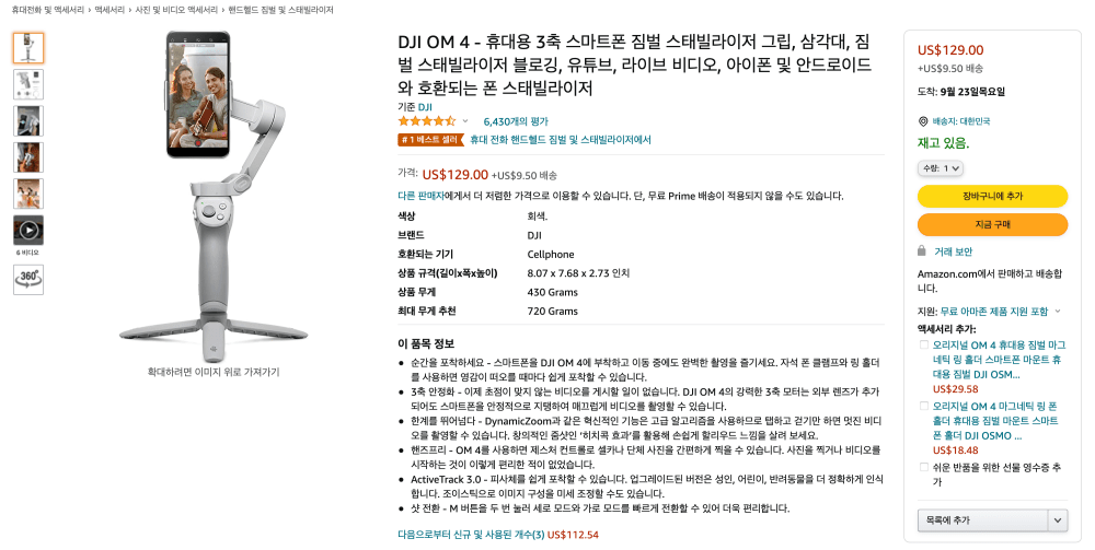 DJI의 오즈모 모바일 4 짐벌을 검색해봤다고 가정해볼게요. 우측을 보시면 배송지가 '대한민국'으로 설정되어 있고, '장바구니에 추가', '지금 구매' 버튼이 활성화되어 있어서 한국으로 직배송이 가능한 상품이랍니다.