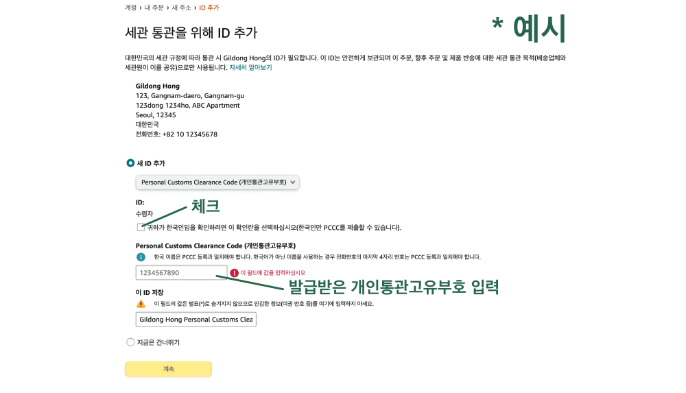 위 화면처럼 '새 ID 추가' 버튼을 클릭하시고 'Personal Customs Clearance Code (개인통관고유부호)'를 선택하세요. 하단 '한국인임을 확인하는 체크박스'에 체크하시고 발급받으신 개인통관고유부호를 입력 후 '계속' 버튼을 누르면 주소 설정이 완벽하게 끝나요.