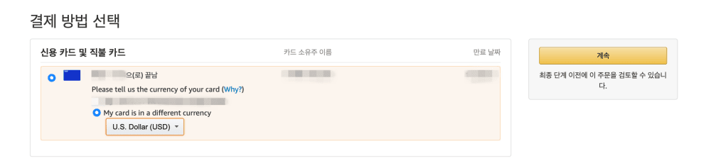 단, 미국 아마존 직구는 결제 단계에서 위 화면과 같이 'My card is in a different currency'를 눌러 꼭 U.S. Dollar (USD)를 선택해야 합니다!