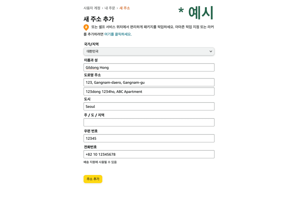 주소 입력 화면으로 이동하면 위 사진과 같은 화면을 볼 수 있을 거예요. 이름과 성에는 영문으로 예시와 같이 적어주시면 됩니다.