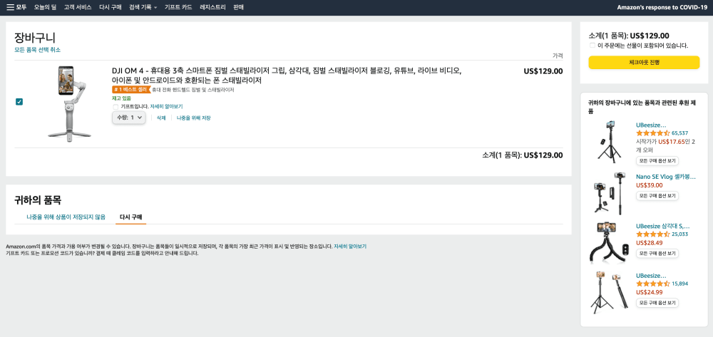 가격은 129달러에 배송비 9.5달러가 더해져 결제금액은 138.5달러였어요. 짐벌은 목록통관 대상 물품이라 이 제품을 구매하면 관부가세가 면제되니, 200달러 이하로 알뜰하게 구매할 수 있겠죠?
